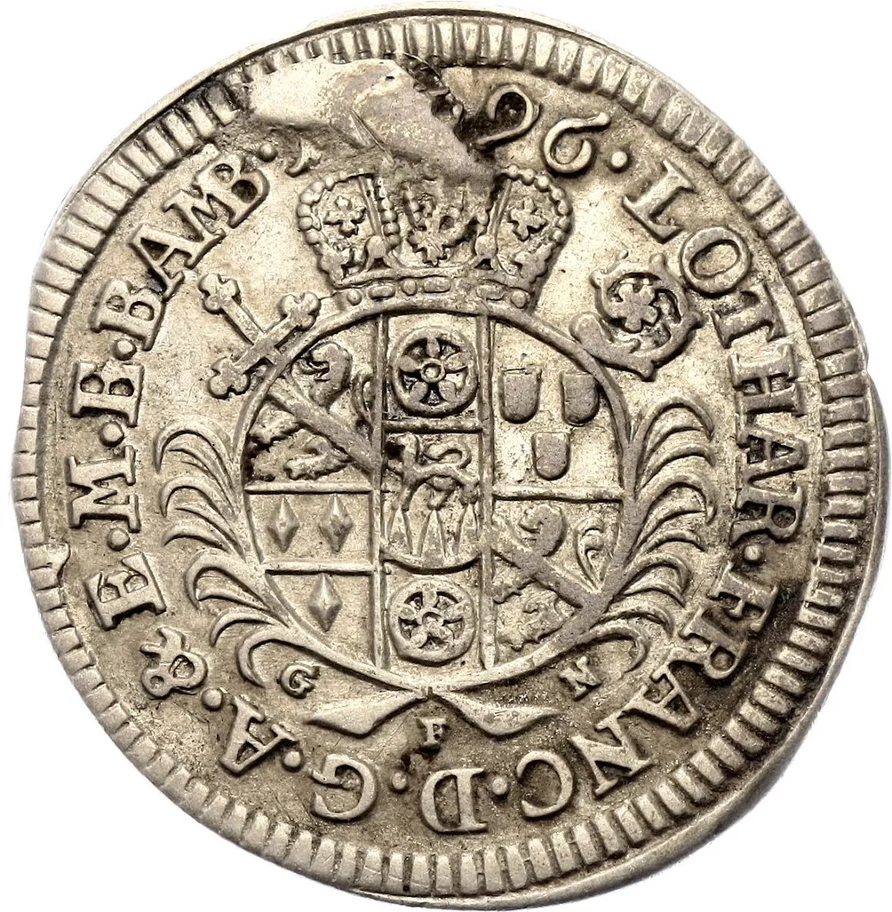 Crowned circular shield with Bamberg arms, palms, and initials GFN. Cross above divides the date.