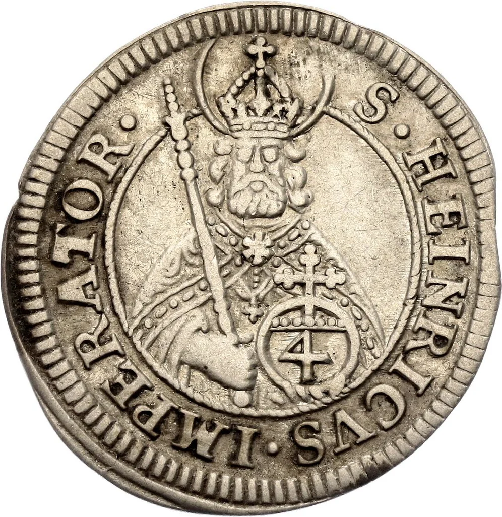 Saint Henry, crowned and nimbate, holding a scepter and orb marked "4".