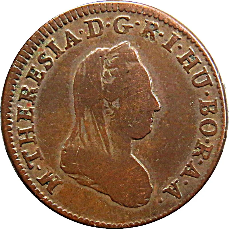 Portrait of Empress Maria Theresia facing right. Inscription: "Maria Theresia, by the grace of God, Empress of the Romans, Queen of Hungary and Bohemia, Archduchess of Austria."