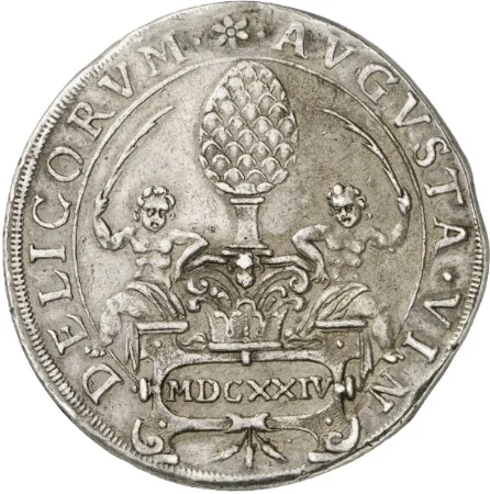 Pine cone flanked by river gods; Roman numeral date in cartouche with three grain heads below.