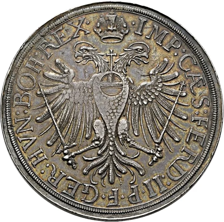 Imperial eagle with crown, orb on breast, bearing Ferdinand II's titles.