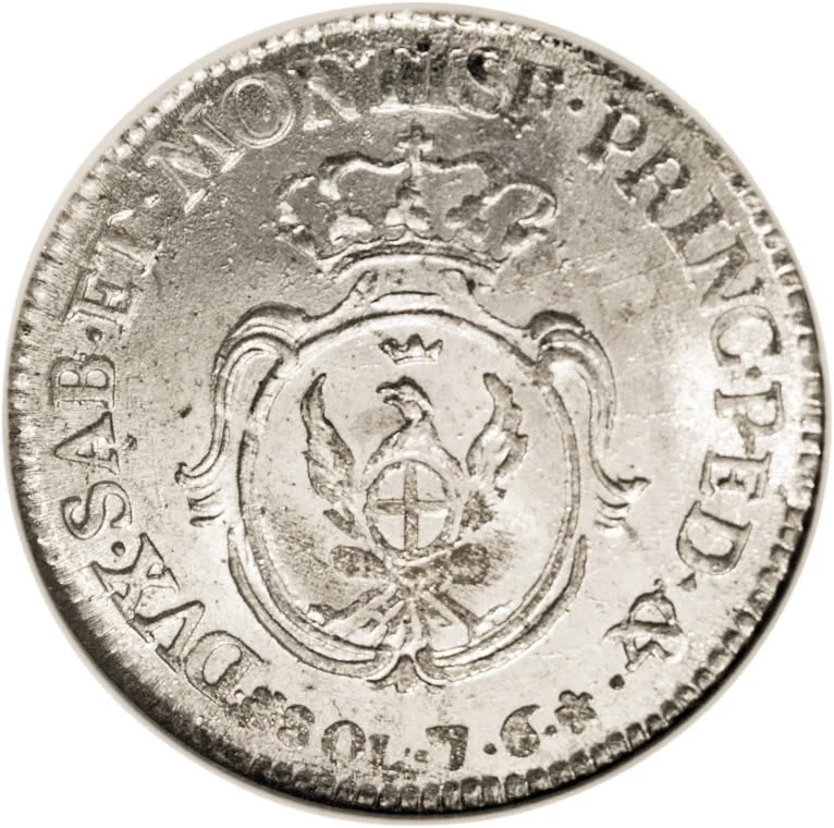 Eagle with Savoy shield, in crowned baroque oval. "SOL 7 6" below.
