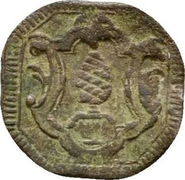 Pine cone in cartouche.