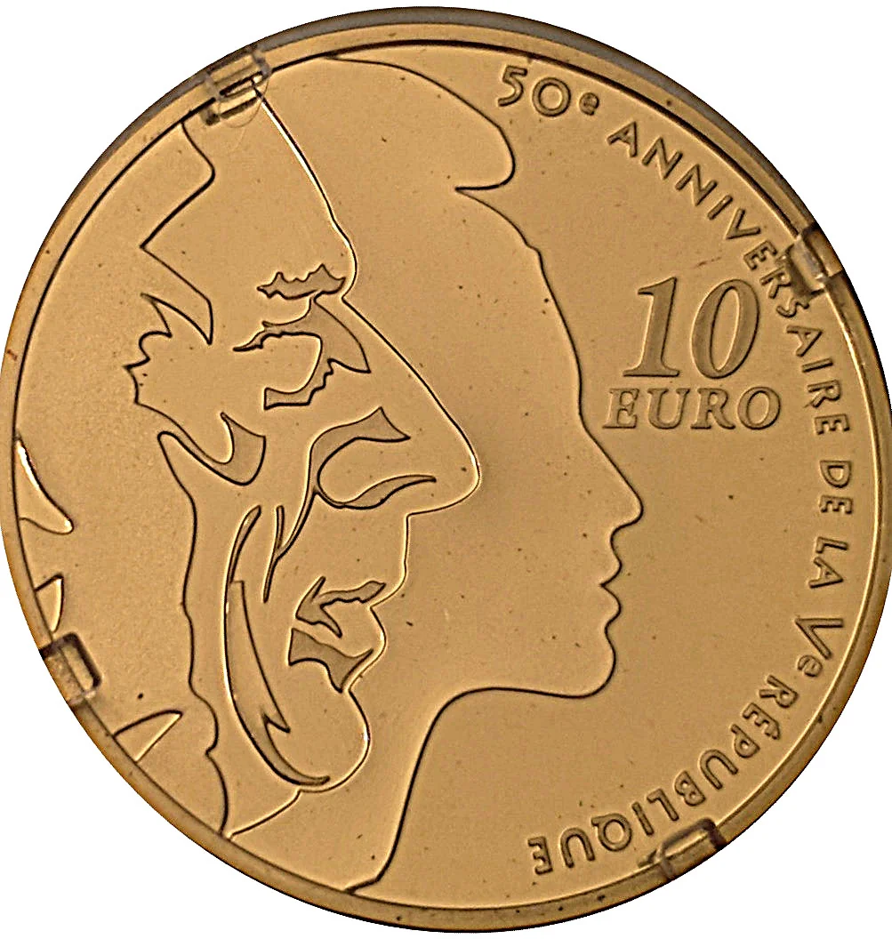 De Gaulle's profile on the right, Marianne on the left. Face value "10 EURO" at right. Along the edge: "50e ANNIVERSAIRE DE LA V RÉPUBLIQUE".