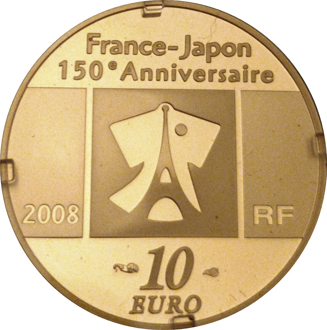 Central open kimono reveals the Eiffel Tower. Above, "France-Japan" and "150th Anniversary". Flanking the kimono: "2008" left, "RF" right. Below, face value "10 EURO" between currency symbols.