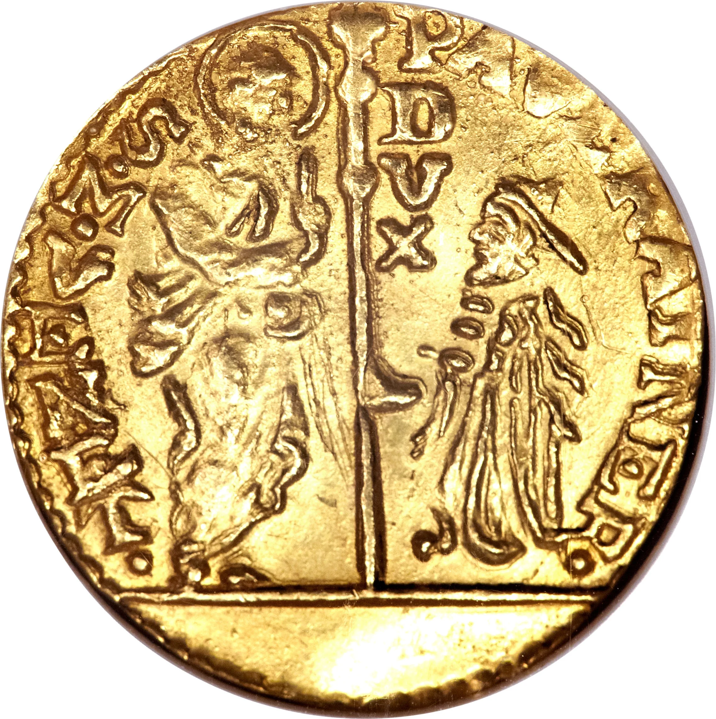 Saint Mark presents his cross-topped staff to a kneeling doge.