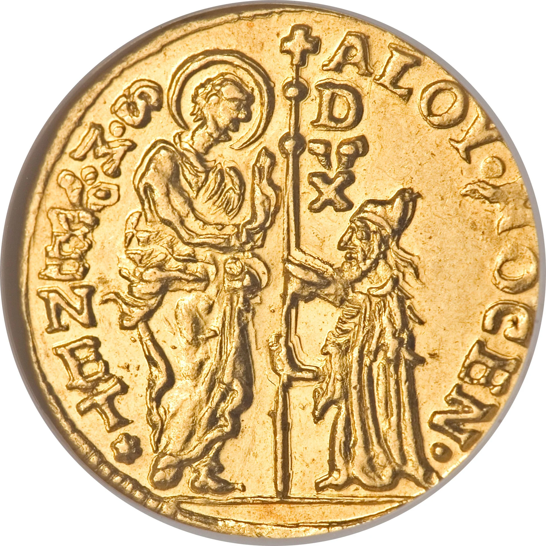 Saint Mark presents his cross-topped staff to a kneeling doge.