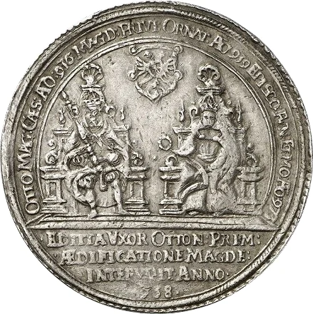 Otto I and Edith enthroned, crowned eagle above, four-line inscription with date 938 below.