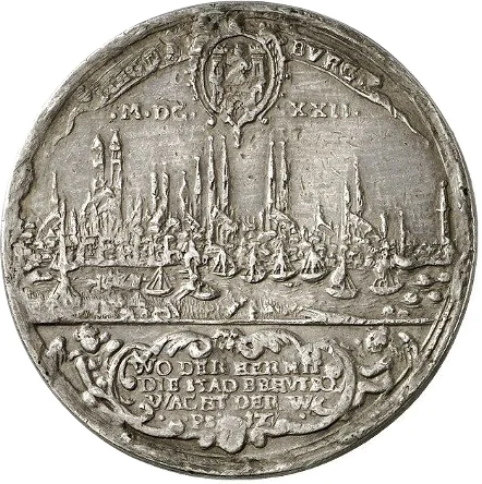 City view, arms above with "MAGDA-BVRG," divided Roman numeral date, three-line inscription in cartouche below.