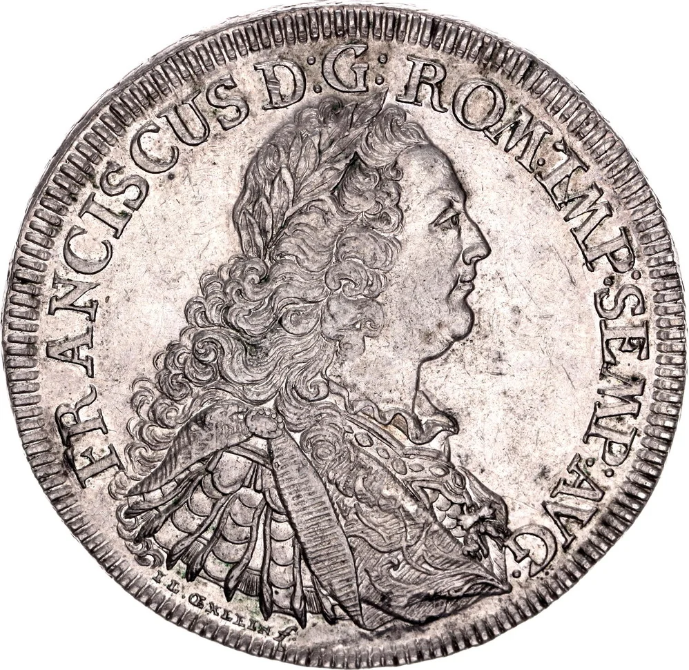 Laureate, draped, and cuirassed bust right wearing the Golden Fleece. Legend around, engraver's signature below.