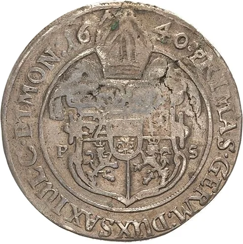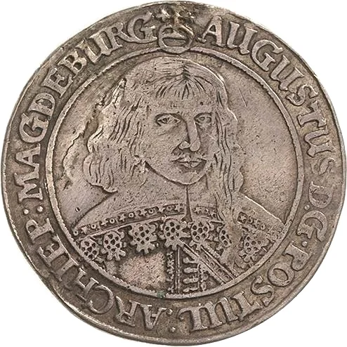 Magdeburg arms with central shield, bishop's mitre above, date in top legend.