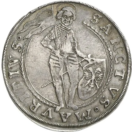 St. Moritz holding Magdeburg's banner and a shield with the imperial eagle.