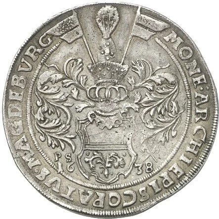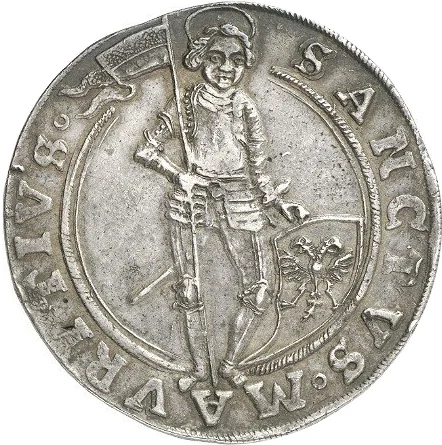 St. Moritz holding Magdeburg's banner and a shield with the imperial eagle.