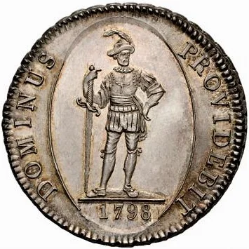A soldier in feathered hat and full regalia stands in an oval recess, his right hand resting a sword on the ground and his left on his hip. Latin legends flank him.