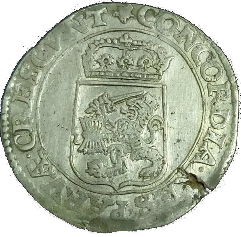 Knight facing right, sword raised, West Friesland shield before him dividing date.