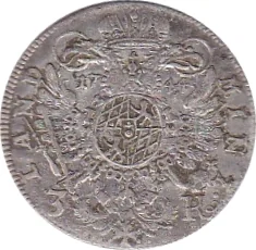 Imperial eagle with crown above date, oval shield with Bavarian and Pfalz arms around central orb, orders' chains, value 3 K by tail.