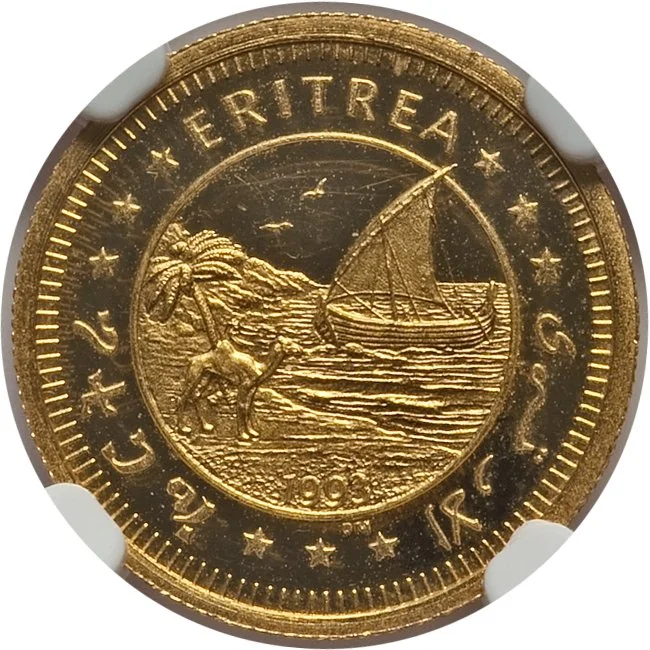 Palm, camel, and dhow in a circle. Tigrinya, English, and Arabic legend on a toothed rim.