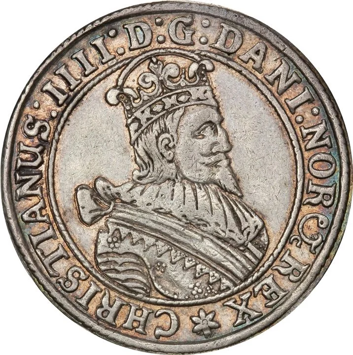 Right-facing bust of Christian IV in high collar, within beaded circle and rim legend. Beaded edge.