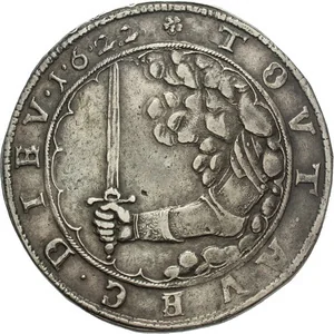 Cloud arm, right, holds upright sword; date below.