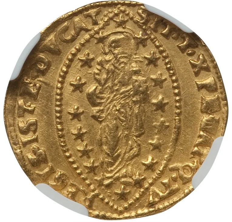 St. Mark presents a staff with a pennant to the kneeling Doge.