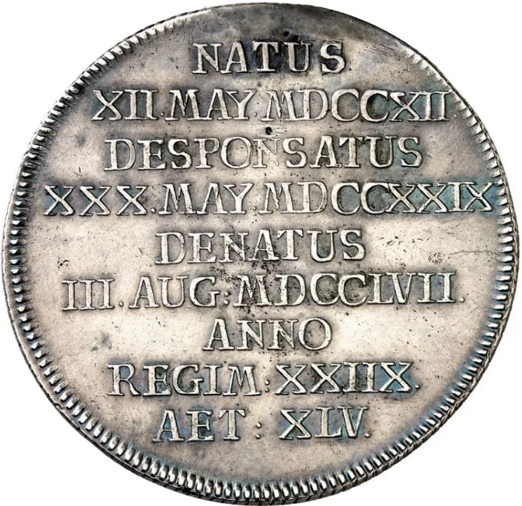 NATUS/ XII. MAY. MDCCXII./ DESPONSATUS/ XXX.MAY MDCCXXIX/ DENATUS/ III.AUG.MDCCLVII./ ANN/ REGIM:XXIIX./ AET: XLV.