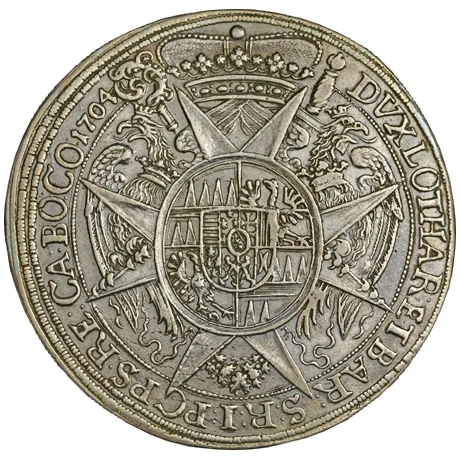 Arms on a Maltese cross, crowned, with supporting eagles. Legend: "Dux Lotharingiae et Barri Sacri Romani Imperii Princeps Regiae Capellae Bohemiae Comes".