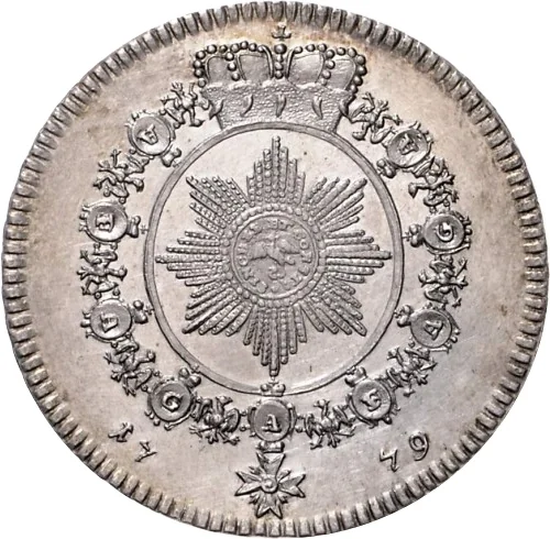 Eagle and motto within a radiant star, encircled by crown and chain.