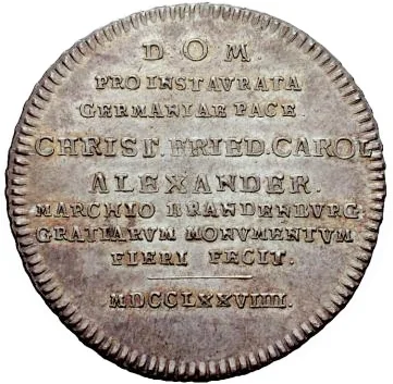 DOM/ PRO INSTAVRATA / GERMANIAE PACE / CHRIST. FRIED. CAROL. / ALEXANDER. / MARCHIO BRANDENBVRG / GRATIARVM MONVMENTVM / FIERI FECIT. / MDCCLXXVIIII.