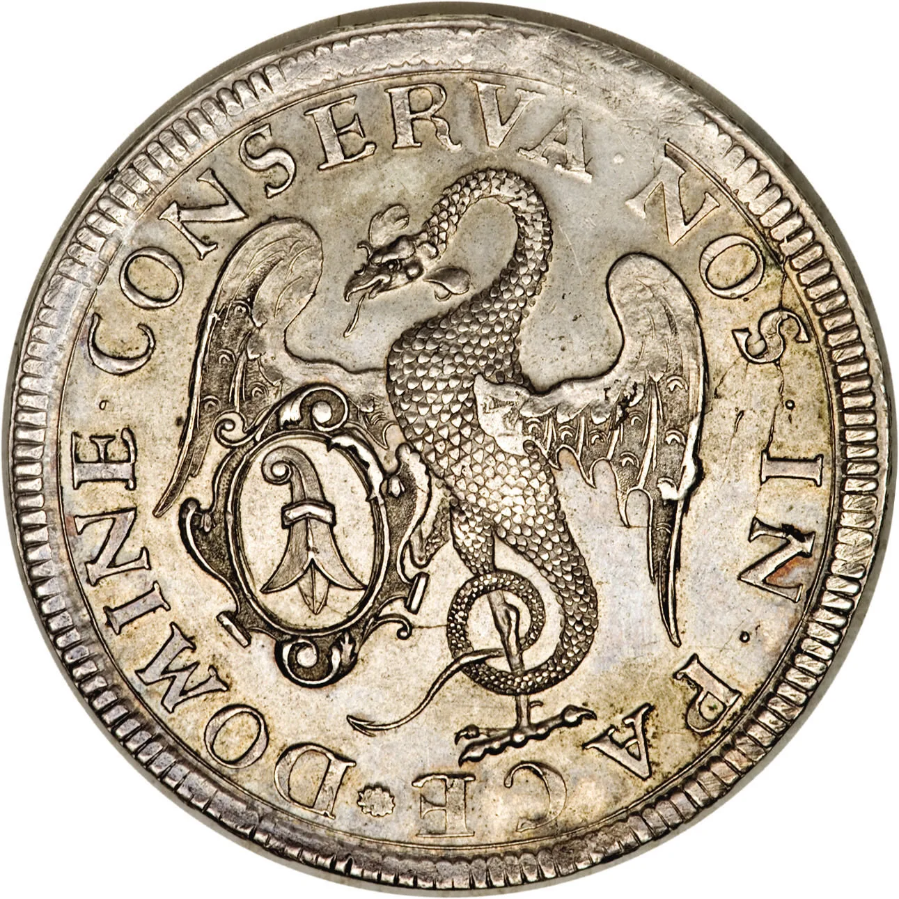 Basel dragon with arms at lower left.