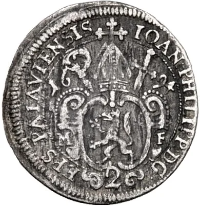 Passau arms split date, value 2 below, Johann Philipp's titles.