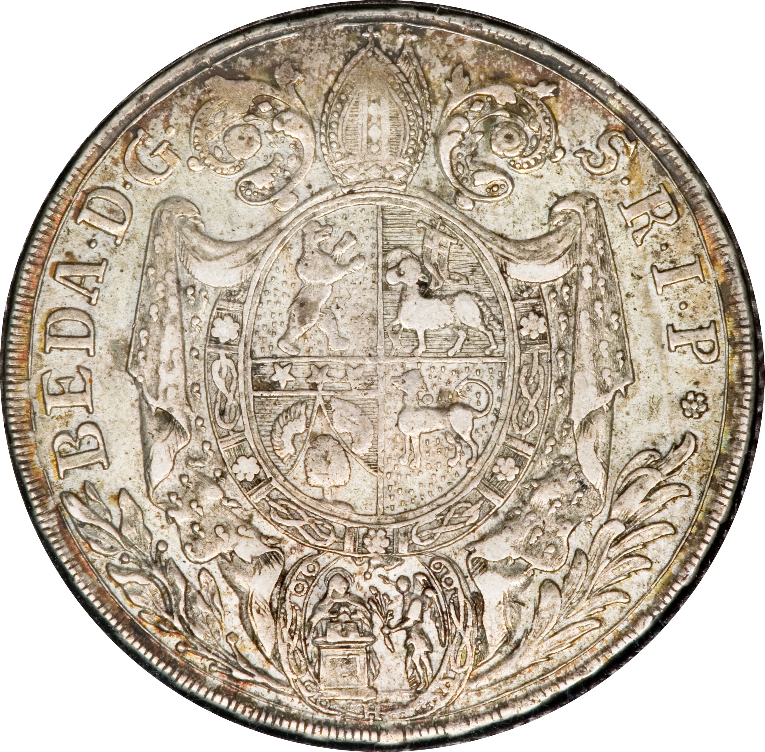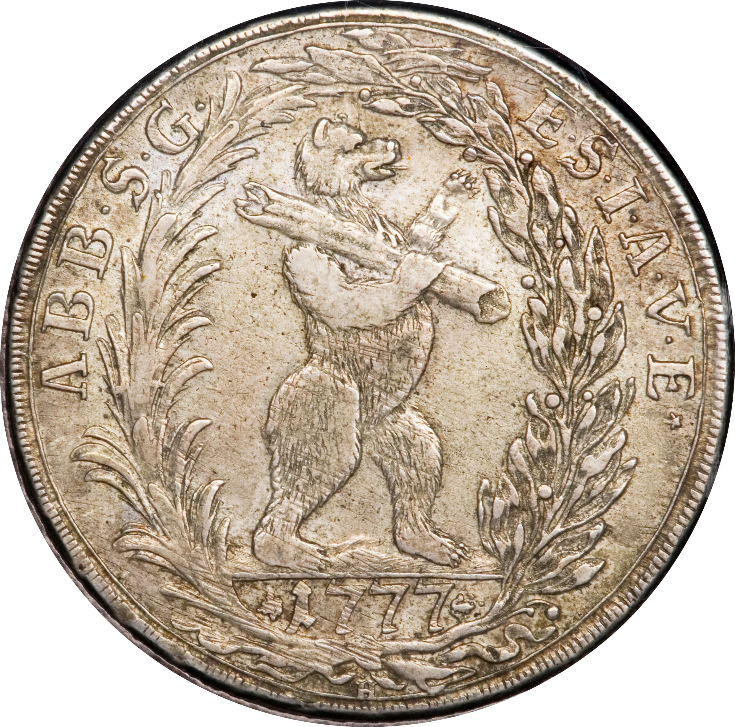 Rampant bear right, date in wreath.