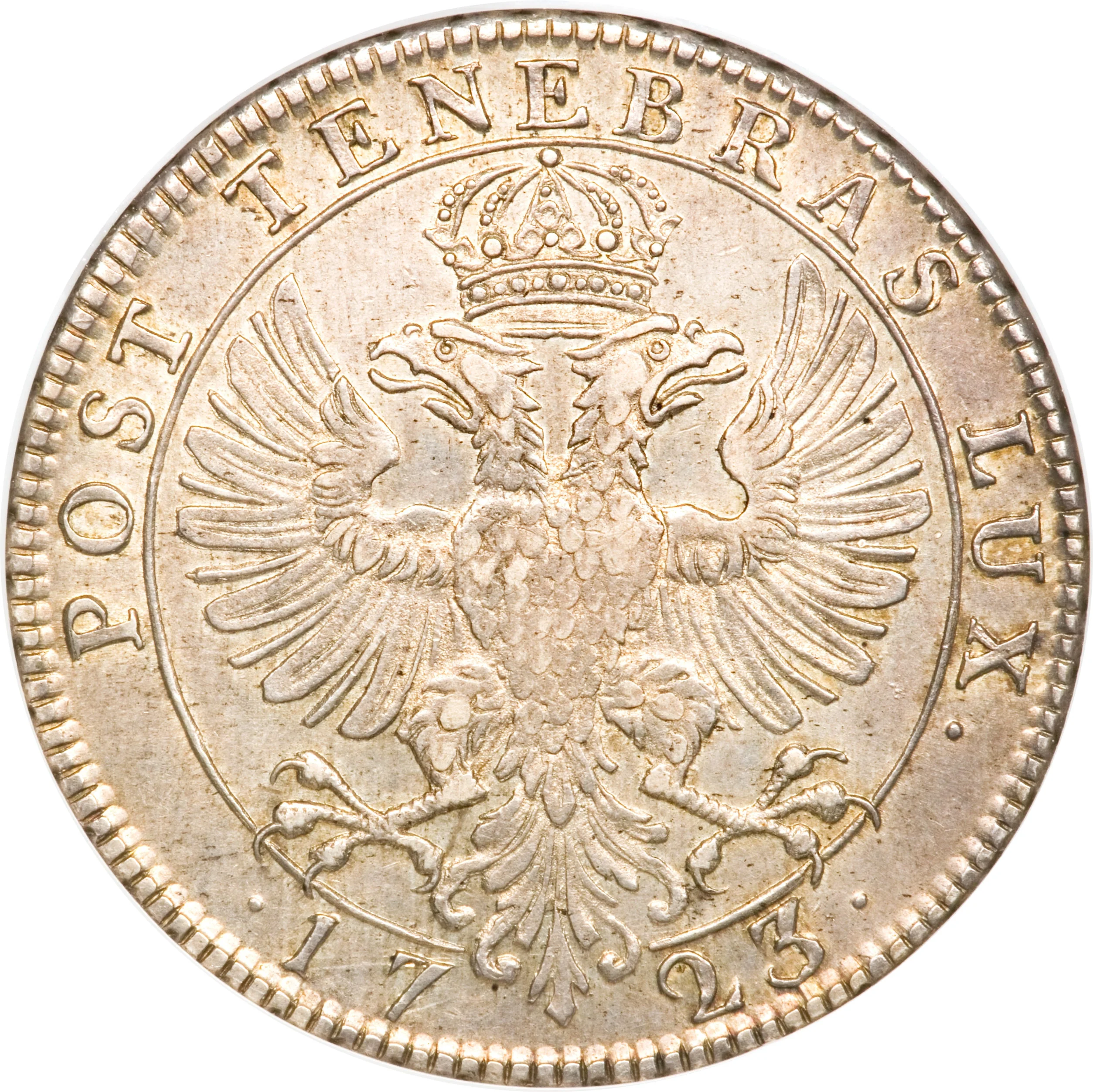 Crowned double eagle in circle, split date below.