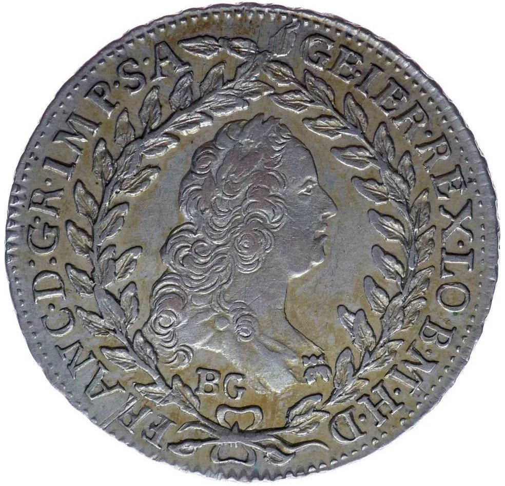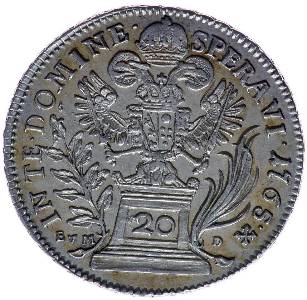 Double-headed crowned eagle on a pedestal with the value, flanked by branches. Its breast bears the arms of Lorraine and Tuscany with the Golden Fleece. The pedestal divides the mintmaster's mark.