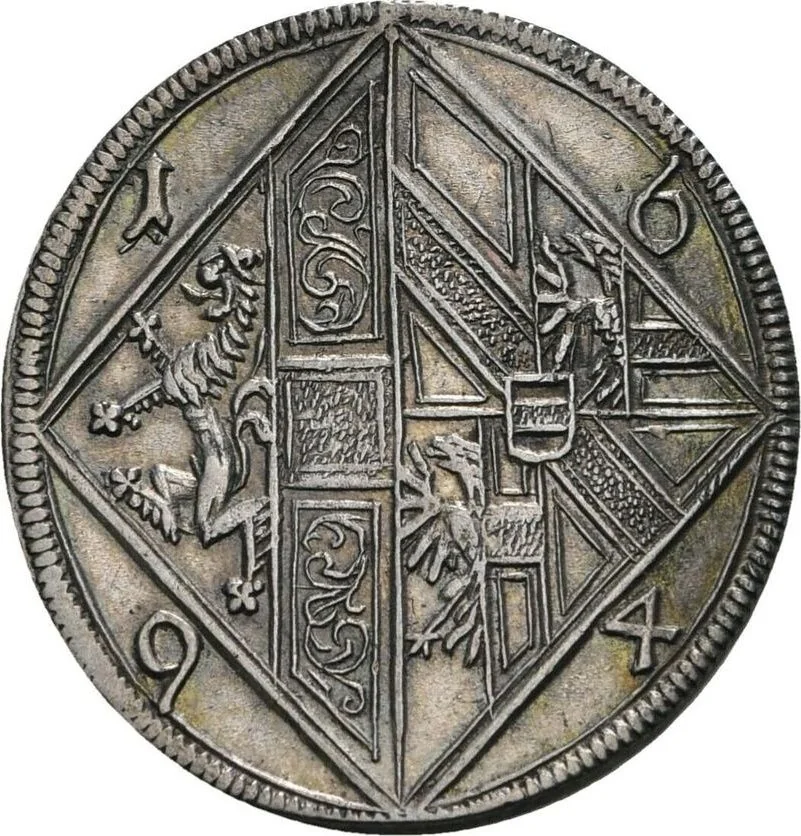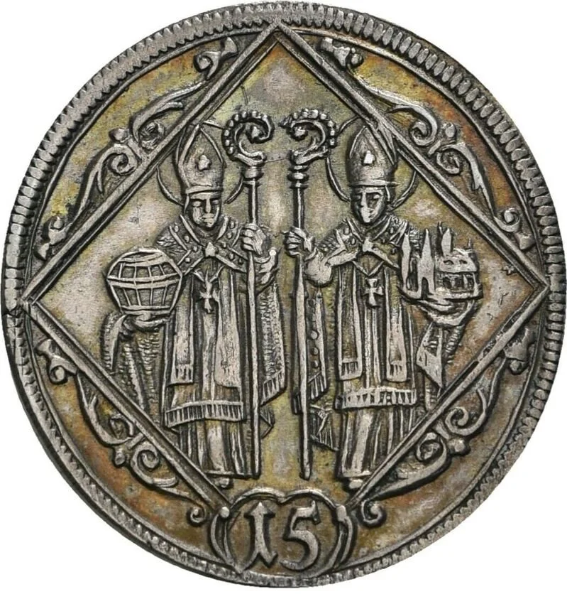 Saints Rupert (with salt box) and Virgil (holding St. Peter's Abbey), both with croziers, inside an ornate diamond. Framed value below.