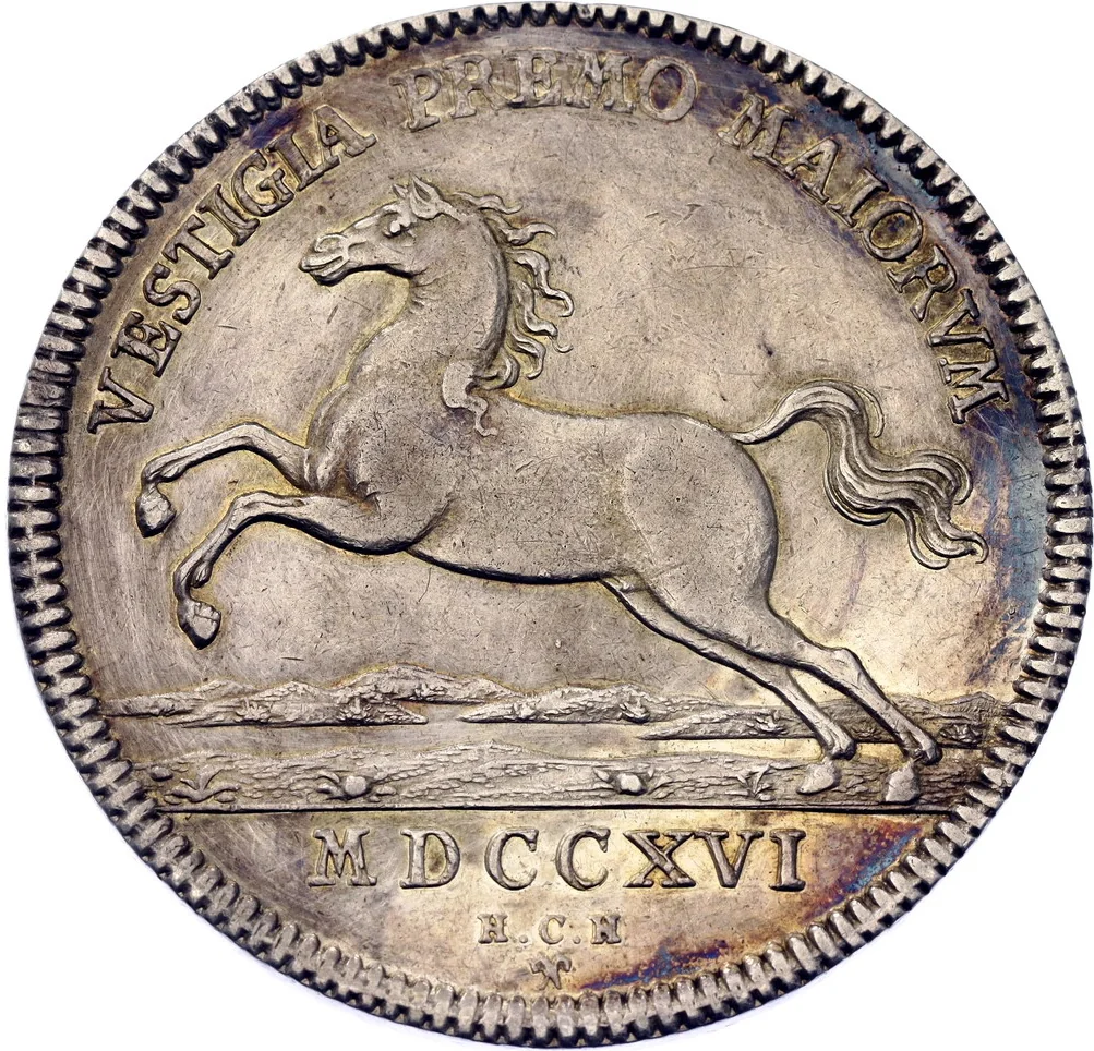 Top: inscription. Center: leaping horse left. Bottom: three-line inscription with date and mintmaster's mark.