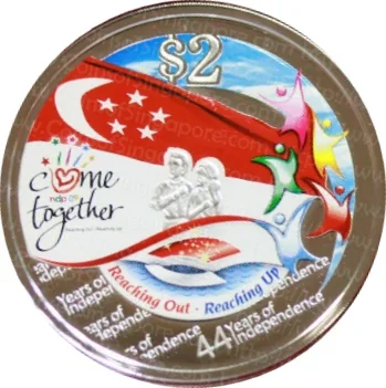 Emblem with date; 'Singapore' encircles it in English, Tamil, Chinese, and Malay.
