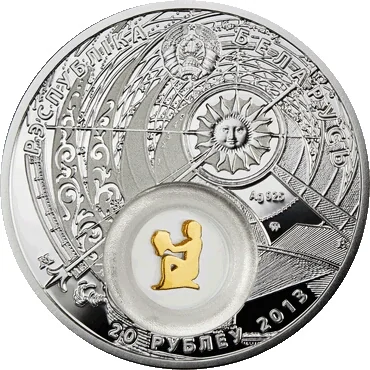 Top: Relief of the State Coat of Arms of Belarus. Center: Engraving fragment from A. Kircher's 'Ars Magna Lucis et Umbrae'. Right: Alloy standard and Mint of Poland trademark. Circumferential inscriptions: 'THE REPUBLIC OF BELARUS' above; '20 RUBLES' and year below.