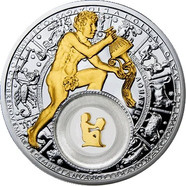 Center: a gold-plated relief of a stylized Aquarius against a stylized clock tower of St Mark's Square, with the circumferential inscription "AQUARIUS" to the right. Below: a transparent capsule containing a movable silver filigree Aquarius plated with gold.