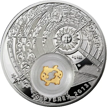 Top: Relief of the State Coat of Arms of Belarus. Center: Engraving fragment from A. Kircher's 'Ars Magna Lucis et Umbrae'. Right: Alloy standard and Mint of Poland trademark. Circumferential inscriptions: 'THE REPUBLIC OF BELARUS' above; '20 RUBLES' and year below.