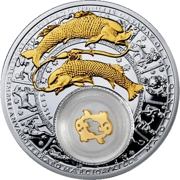 Centered: a gold relief of two stylized fish against the clock tower of St Mark's, Venice, encircled by "PISCES." Below: a capsule with a movable gold-plated silver filigree fish.