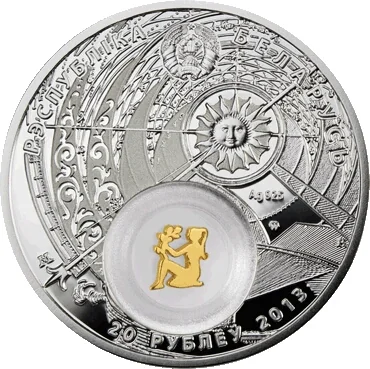 Top: Relief of the State Coat of Arms of Belarus. Center: Engraving fragment from A. Kircher's 'Ars Magna Lucis et Umbrae'. Right: Alloy standard and Mint of Poland trademark. Circumferential inscriptions: 'THE REPUBLIC OF BELARUS' above; '20 RUBLES' and year below.
