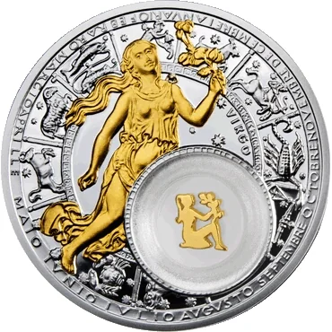 Center: a gold-plated relief of a stylized young woman against a stylized clock tower of St Mark's, Venice, with the circumferential inscription "VIRGO" to the right. Below: a transparent capsule with a movable gold-plated silver filigree shaped as a young woman.