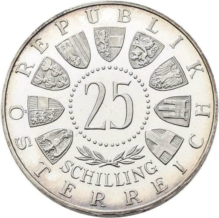 Beaded circle with central value, leaf spray below, encircled by shields.