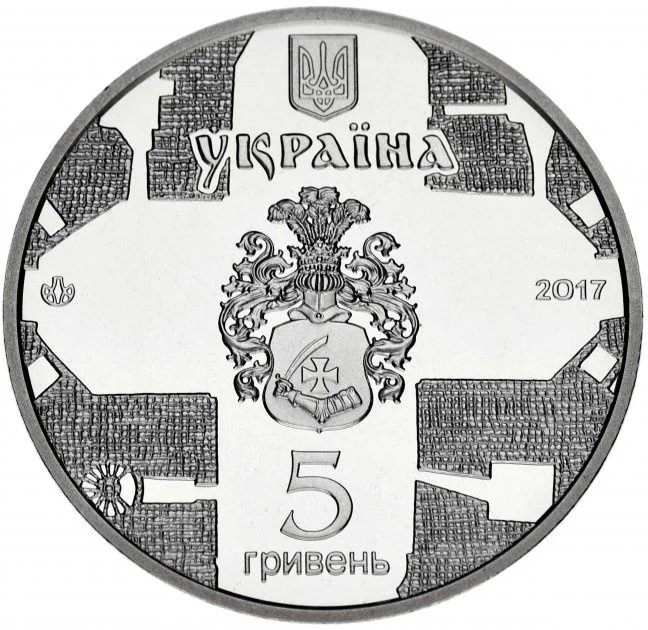 The obverse features Ukraine's small coat of arms above УКРАЇНА. Centered is the Lyzohub family coat of arms on a cross-shaped church layout. To the right is 2017; below is 5/ГРИВЕНЬ and to the left, the NBU mint mark.
