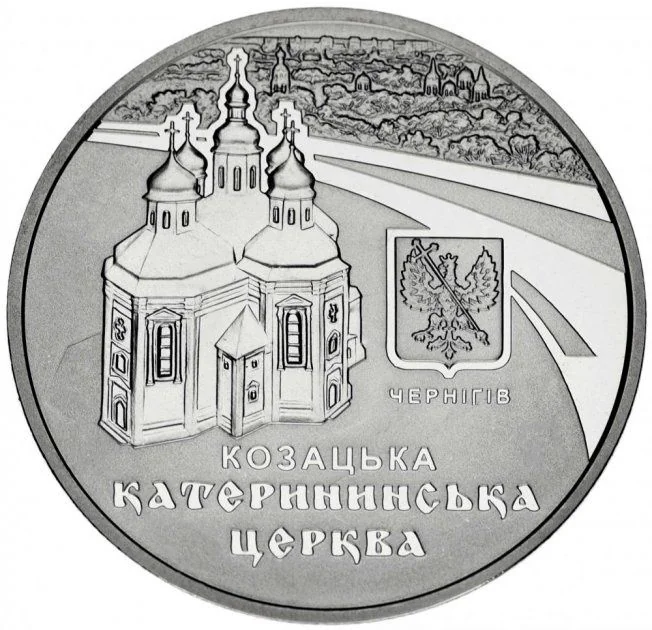 Chernihiv's coat of arms and a road symbol accompany an aerial view of St. Catherine's Church, labeled in Ukrainian.