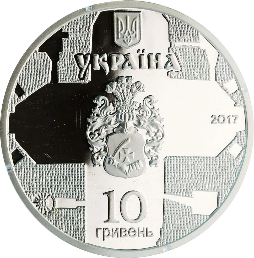 The Ukrainian small coat of arms is above the word УКРАЇНА. The central design features the Lyzohub family crest set within the cross-shaped layout of a church. To the right is the year 2017, and below are the denomination markings: 10 ГРИВЕНЬ on the silver coin.
