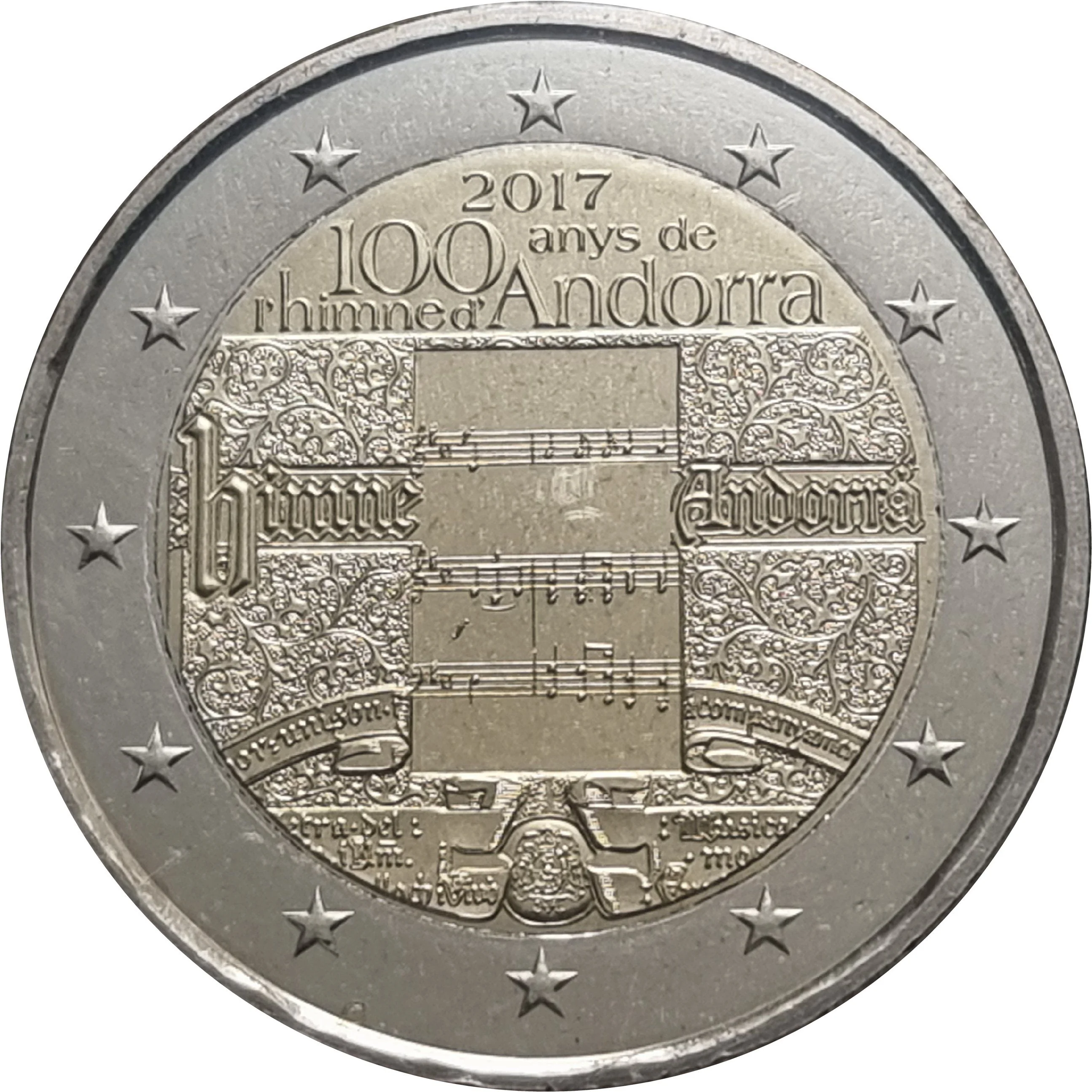 Description: A 1914 partial reproduction of Andorra's anthem, featuring its opening notes amid floral ornamentation and surrounded by the European flag's twelve stars.