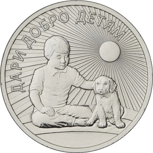 A boy and puppy in relief with sun rays, encircled by "ДАРИ ДОБРО ДЕТЯМ" (GIVE GOOD TO CHILDREN).