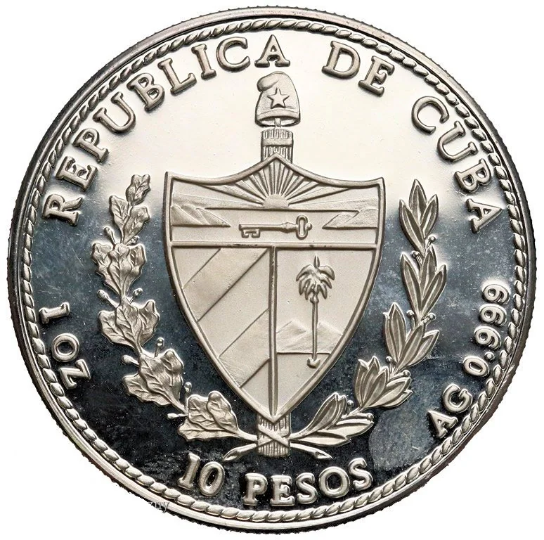 Cuban coat of arms with curved country name above, face value below, weight and fineness on sides, rope edge design.
