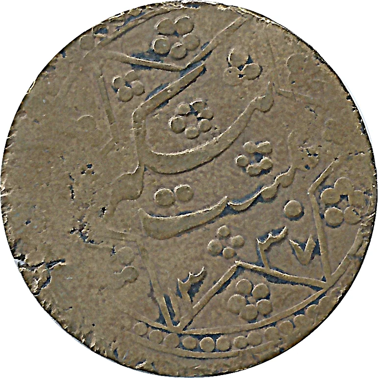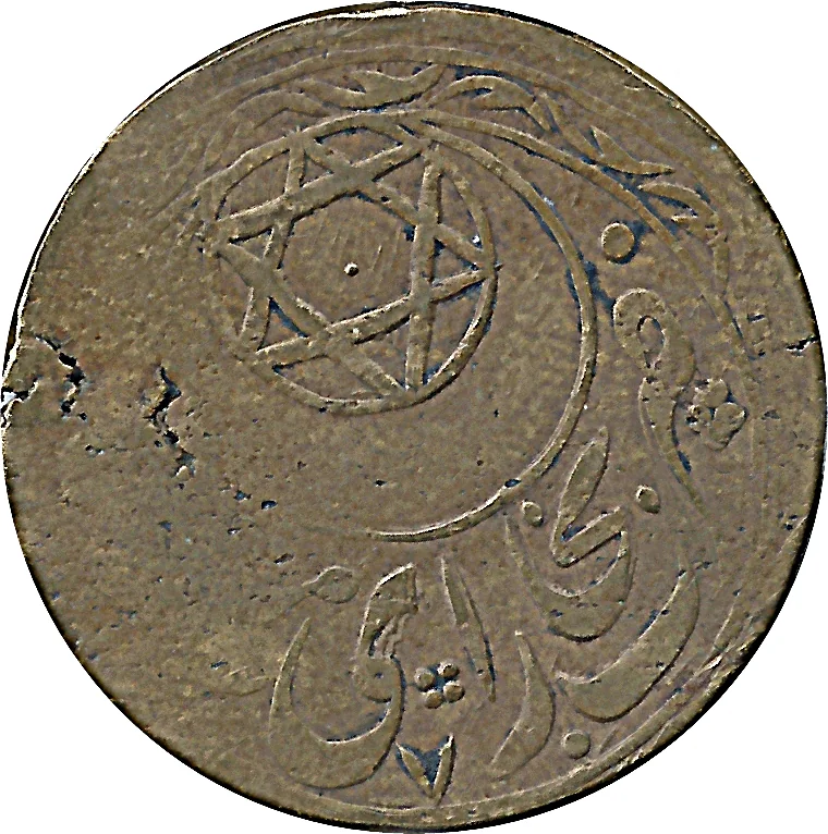 Crescent with inscription and date, topped by a circled six-pointed star.